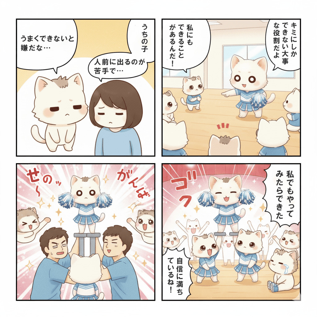 チアリーディングは、一瞬の輝きをチーム全員で作り上げるスポーツです。そこでは、動きの大きさや完成度だけでなく、お互いの努力を認め合い、大きな声で「大丈夫!」「一緒にやろう!」と励ます心が重要になります。